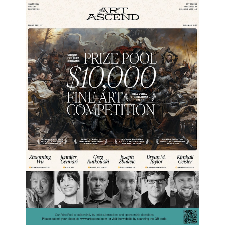 Artists worldwide, 18 years or older, are invited to submit entries for the Art Ascend Global Online Competition. $10,000 in awards. Jurors: Zhaoming Wu, Jennifer Gennari, Greg Rutkowski, Joseph Zbukvic, Bryan M. Taylor, Kimball Geisler. There are no rules on style as we encourage artists to develop and push their own personal style. Work must be original, no AI permitted, and created within the last 3 years. Maximum of 5 works per category. All submitted images must be high-resolution. Application submission grants Art Ascend rights for promotional use for submitted artwork. No graphic violence, pornography, or activism. Early Bird price: $19.99 USD/entry (During January only); Normal price: $29.99 USD/entry. Deadline: March 31, 2026. More info. Contact: email